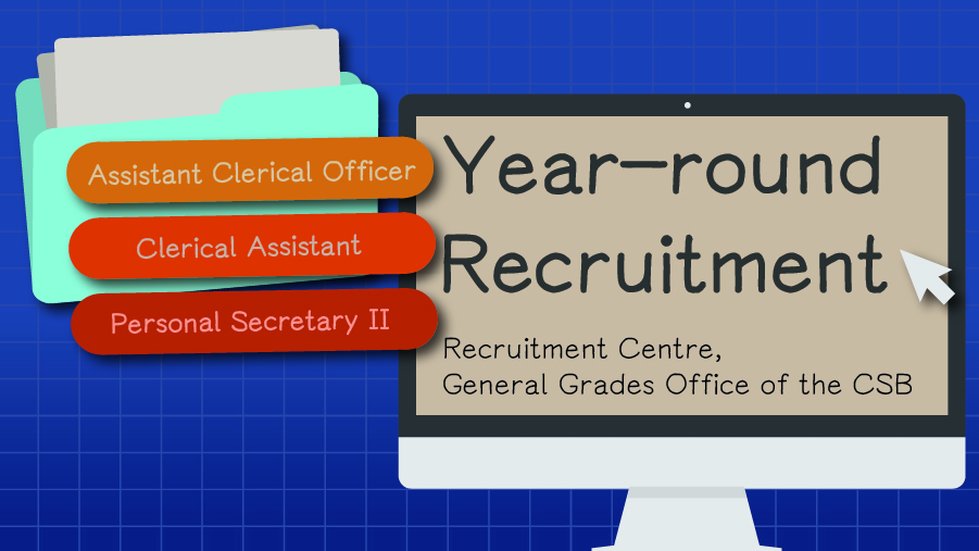 The recruitment of Clerical Assistant is open year-round! Click here to apply now.DutiesA Clerical Assistant (CA) is mainly deployed on general and basic clerical duties which may involve multi-tasks relating to one or a combination of the following functional areas: (a) general office support; (b) personnel; (c) finance and accounts; (d) customer service; (e) licensing and registration; (f) statistical duties; (g) information technology support; and (h) other departmental support.A CA is subject to posting to any government offices in any districts of Hong Kong; is required to use information technology applications in the discharge of duties; and may be required to work irregular hours or shifts and wear uniform at work. Salary and BenefitsSalary: Master Pay Scale Point 1 (HK$14,735 per month) to Master Pay Scale Point 10 (HK$25,815 per month).Fringe Benefits: Vacation leave; Medical and dental benefits; Housing benefits Entry RequirementsCompleted Secondary 4 with subjects studied including Mathematics, or equivalent; andAttained a level of proficiency in Chinese Language and English Language equivalent to Secondary 4 standard; andChinese word processing speed of 15 words per minute and English word processing speed of 20 words per minute, and knowledge in the application of common business software; andA pass result in the Basic Law and National Security Law Test. Please visit the website of Civil Service Bureau and Government Vacancies Enquiry webpage for more details.