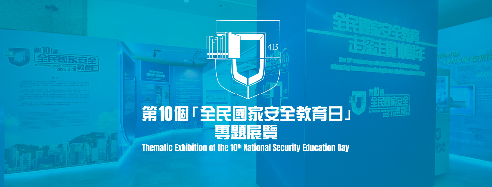 The 10th National Security Education Day Thematic Exhibition reflects on the development of promoting national security education at the national and the Hong Kong Special Administrative Region (HKSAR) levels over the years. This year marks the 10th National Security Education Day, with the national theme of "The 10th anniversary of National Security Education Day: advancing towards more in-depth and effective implementation". The HKSAR Government has always been committed to promoting national security education. Over the years, under the leadership of the Central Government and with the support of various offices of the Central Authorities in Hong Kong as well as the joint efforts of all sectors of society, diverse creative promotion activities have been successfully held with widespread participation.
