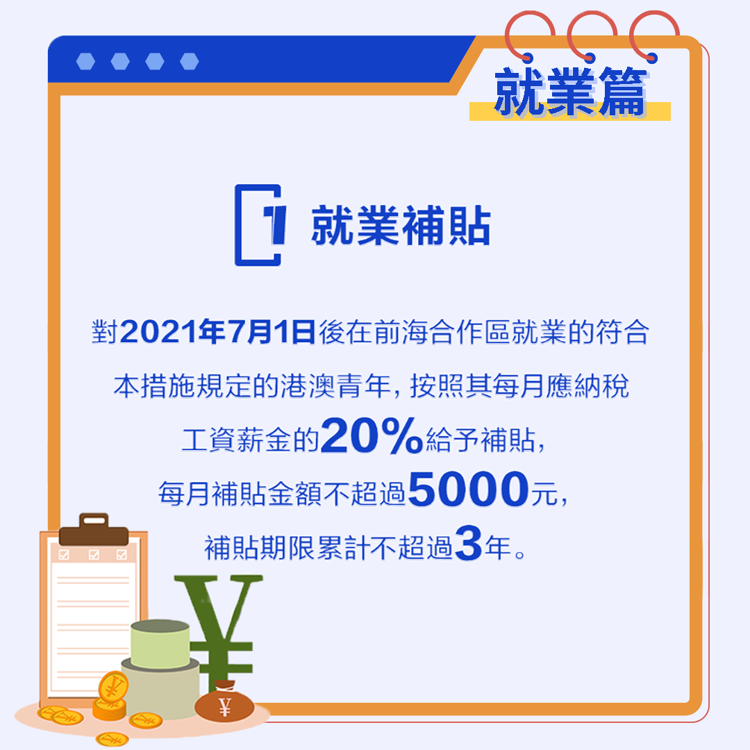 1. 就业补贴。对2021年7月1日后在前海合作区就业的符合本措施规定的港澳青年,按照其每月应纳税工资薪金的20%给予补贴,每月补贴金额不超过5000元,补贴期限累计不超过3年。