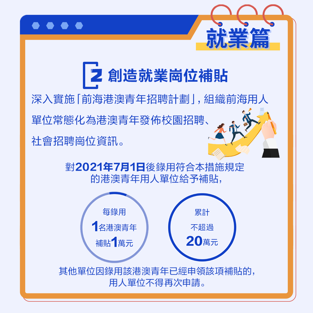 支持港澳青年实习就业方面,包括就业补贴、创造就业岗位补贴、实习单位补贴等3条措施,支持和鼓励各阶段的港澳青年来前海实习、就业,引导港澳青年通过前海瞭解内地。
