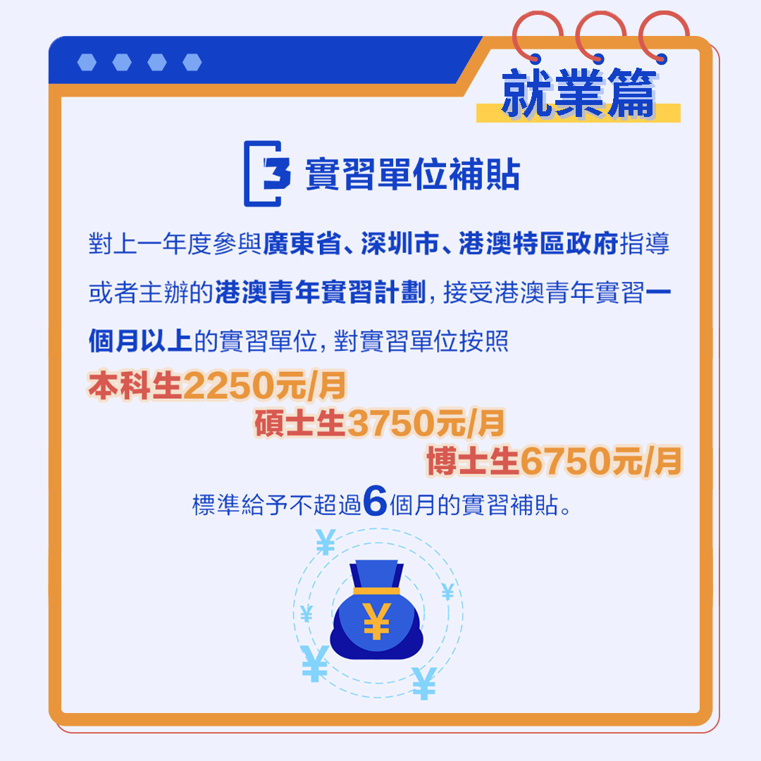 3. 实习单位补贴。对上一年度参与广东省、深圳市、港澳特区政府指导或者主办的港澳青年实习计划,接受港澳青年实习一个月以上的实习单位,对实习单位按照本科生2250元/月、硕士生3750元/月、博士生6750元/月的标准给予不超过6个月的实习补贴。