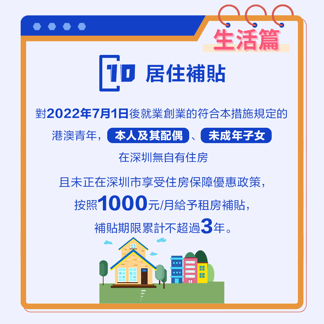 10. 居住补贴。对2022年7月1日后就业创业的符合本措施规定的港澳青年,本人及其配偶、未成年子女在深圳无自有住房,且未正在深圳市享受住房保障优惠政策,按照1000元/月给予租房补贴,补贴期限累计不超过3年。