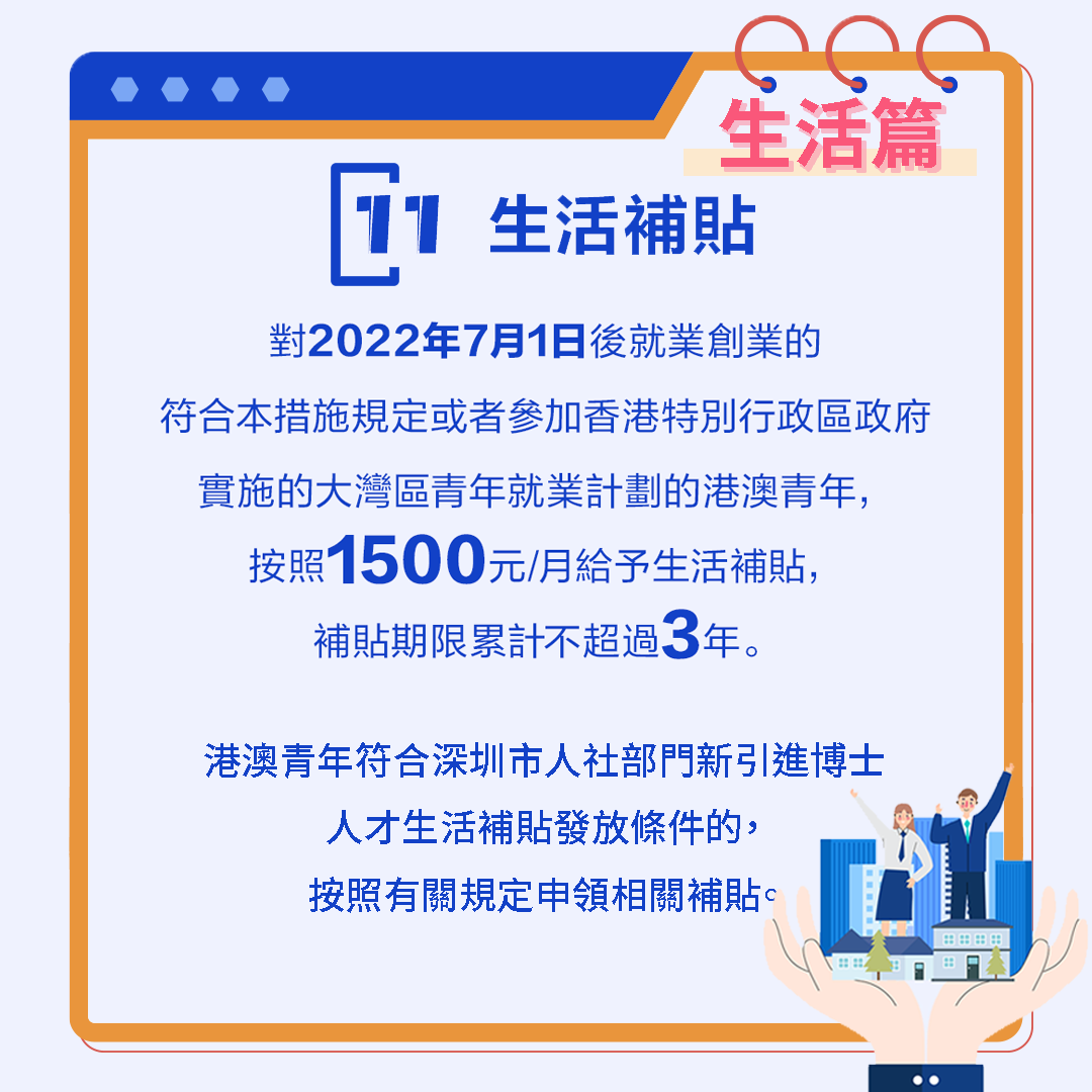 11. 生活补贴。对2022年7月1日后就业创业的符合本措施规定或者参加香港特别行政区政府实施的大湾区青年就业计划的港澳青年,按照1500元/月给予生活补贴,补贴期限累计不超过3年。港澳青年符合深圳市人社部门新引进博士人才生活补贴发放条件的,按照有关规定申领相关补贴。