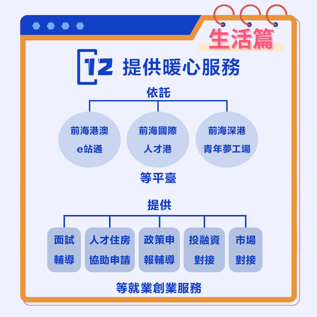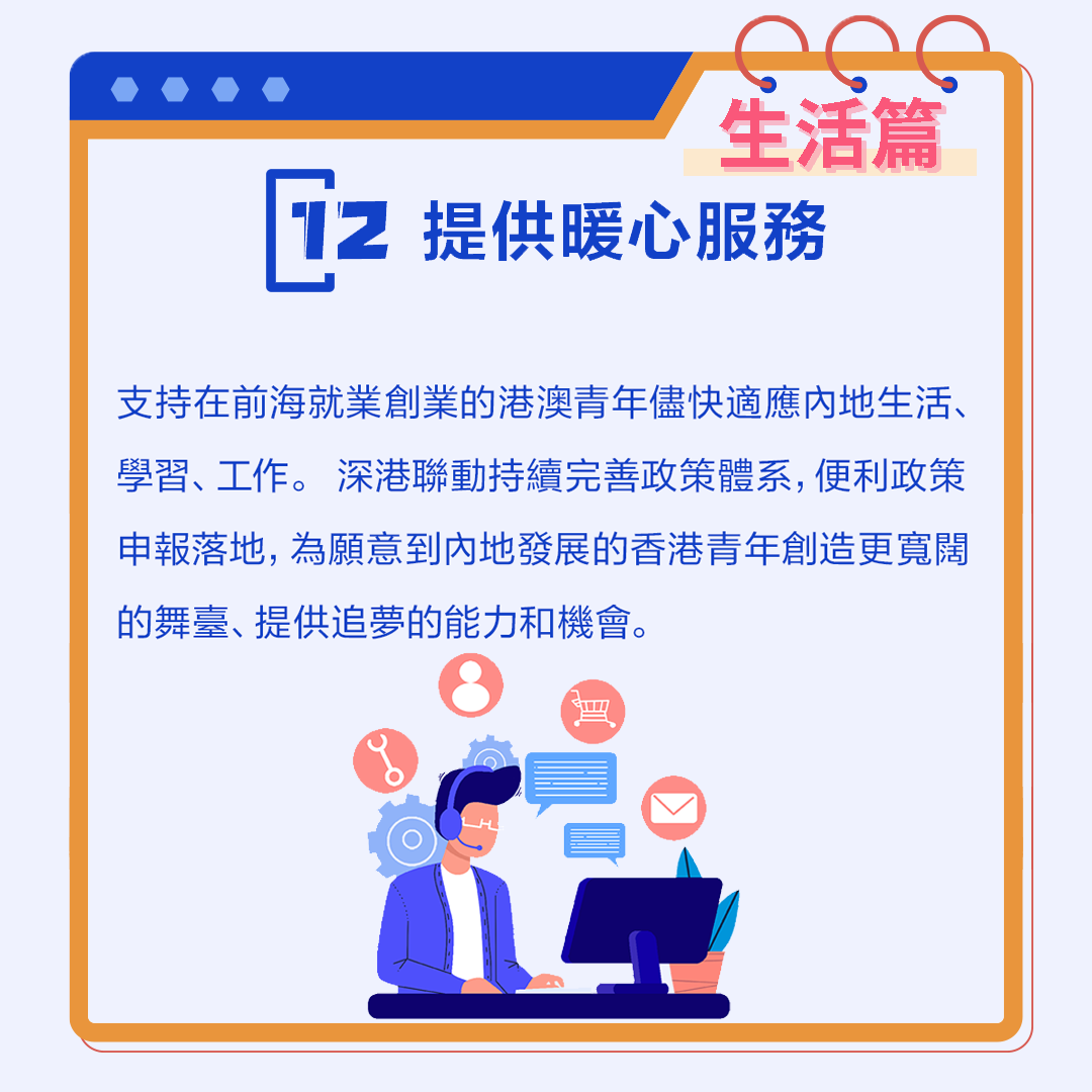 12. 提供暖心服务。依託「前海港澳e站通」、前海国际人才港、前海深港青年梦工厂等平台,提供面试辅导、人才住房协助申请、政策申报辅导、投融资对接、市场对接等就业创业服务,支援在前海就业创业的港澳青年尽快适应内地生活、学习、工作。深港联动持续完善政策体系,便利政策申报落地,为愿意到内地发展的香港青年创造更宽阔的舞台、提供追梦的能力和机会。