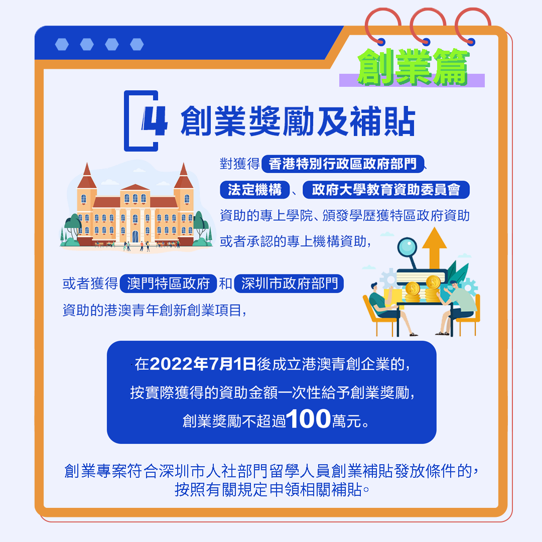 4. 创业奖励及补贴。对获得香港特别行政区政府部门、法定机构、政府大学教育资助委员会资助的专上学院、颁发学历获特区政府资助或者承认的专上机构资助,或者获得澳门特区政府和深圳市政府部门资助的港澳青年创新创业专案,在2022年7月1日后成立港澳青创企业的,按实际获得的资助金额一次性给予创业奖励,创业奖励不超过100万元。创业专案符合深圳市人社部门留学人员创业补贴发放条件的,按照有关规定申领相关补贴。