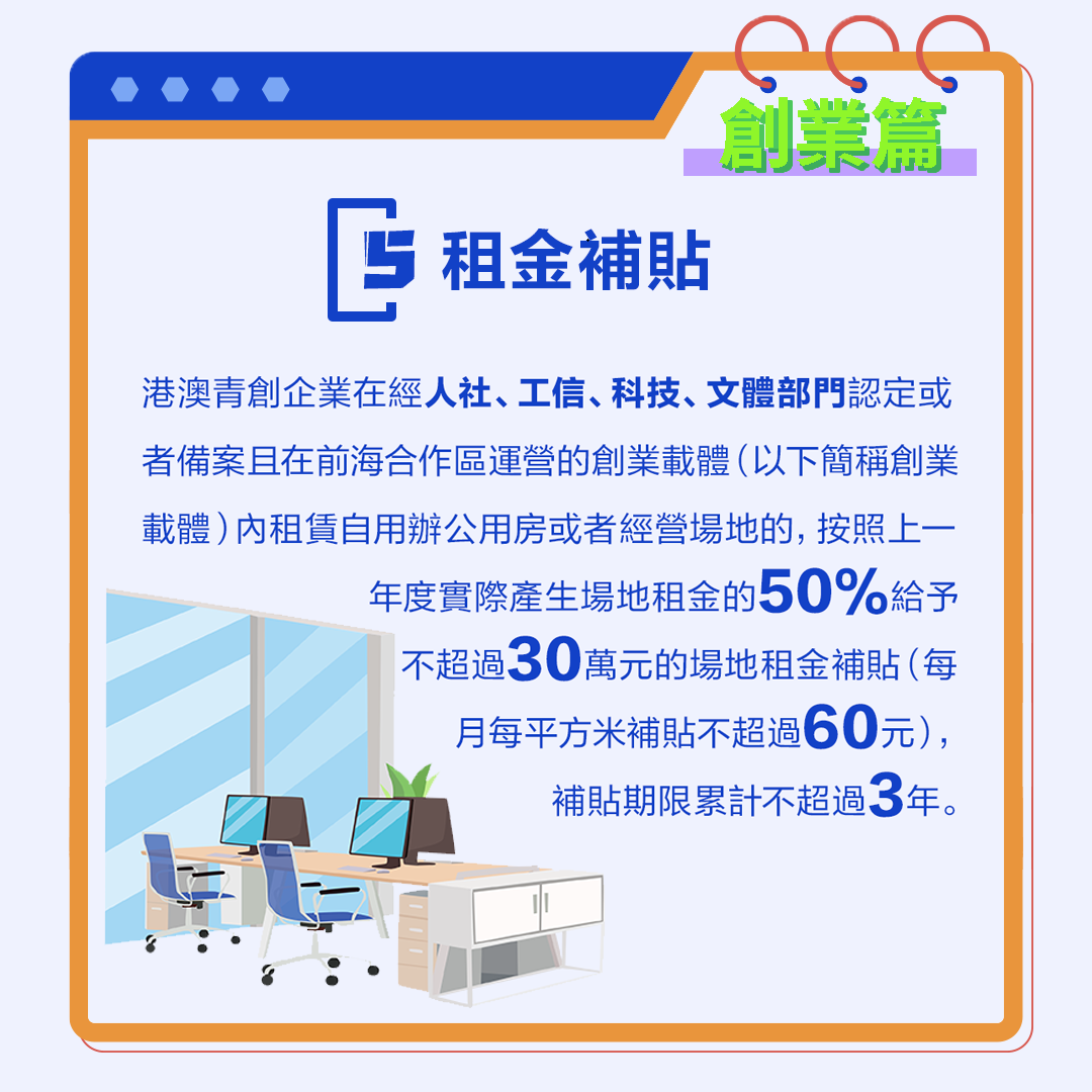 5. 租金补贴。港澳青创企业在经人社、工信、科技、文体部门认定或者备案且在前海合作区运营的创业载体(以下简称创业载体)内租赁自用办公用房或者经营场地的,按照上一年度实际产生场地租金的50%给予不超过30万元的场地租金补贴(每月每平方米补贴不超过60元),补贴期限累计不超过3年。