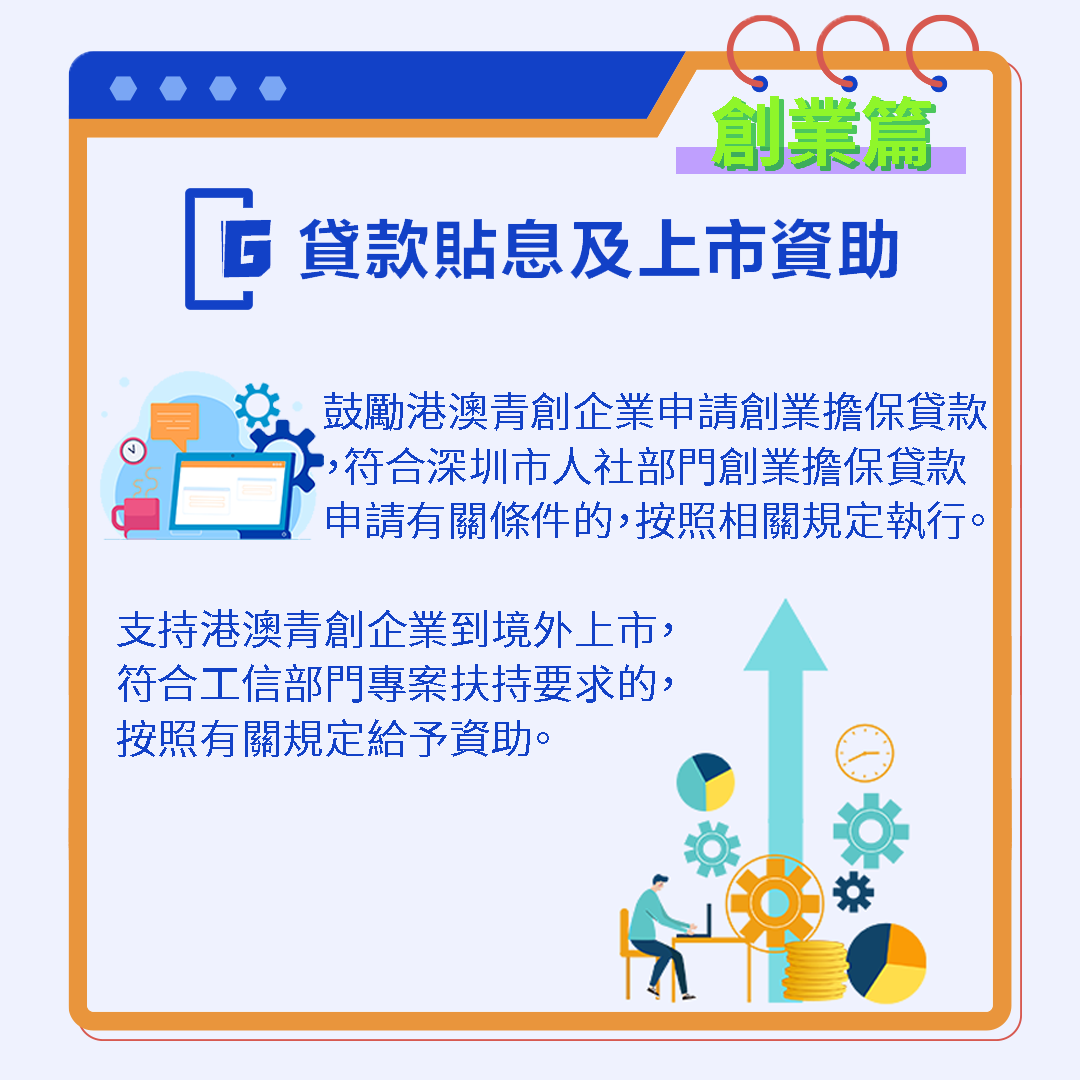 6. 贷款贴息及上市资助。鼓励港澳青创企业申请创业担保贷款,符合深圳市人社部门创业担保贷款申请有关条件的,按照相关规定执行。支持港澳青创企业到境外上市,符合工信部门专案扶持要求的,按照有关规定给予资助。