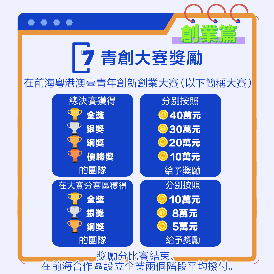 7. 青创大赛奖励。在前海粤港澳台青年创新创业大赛(以下简称大赛)总决赛获得金奖、银奖、铜奖、优胜奖的团队,分别按照40万元、30万元、20万元、10万元给予奖励;在大赛分赛区获得金奖、银奖、铜奖的团队,分别按照10万元、8万元、5万元给予奖励。奖励分比赛结束、在前海合作区设立企业两个阶段平均拨付。