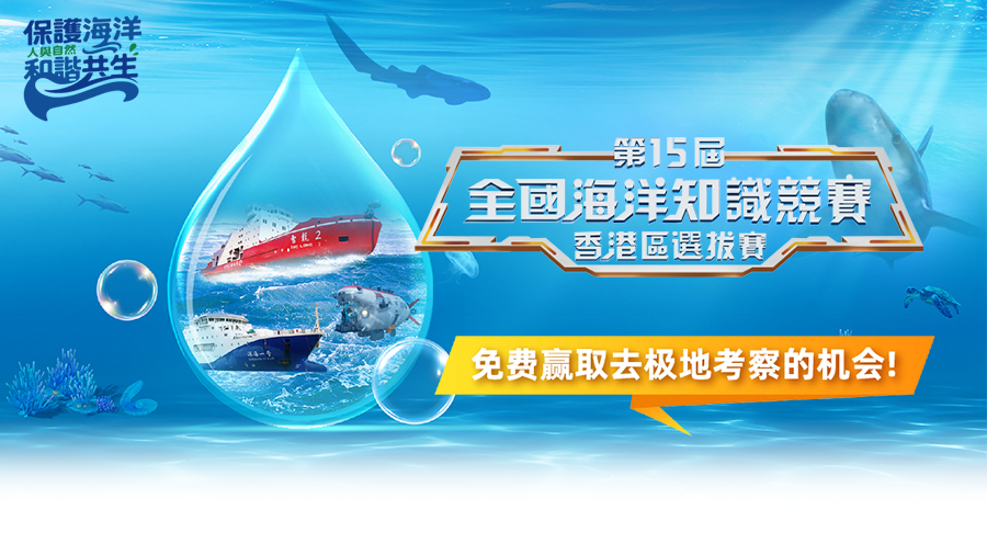 比赛简介「全国海洋知识竞赛」自2008年创办,至今已成功举办十四届,是由自然资源部、共青团中央、海军政治工作部共同主办的全国大型海洋知识普及活动。每届比赛吸引全国200多间高等院校、超过20万名大专生踊跃参与,总决赛前三名选手更可获得参与国家南极、北极和大洋科学考察的机会。比赛组别2025年启动的第十五届赛事首次增设香港地区选拔赛,比赛分别设有「大专生组」及「公众答题」,「大专生组」通过线上初赛、线下复赛及现场决赛,从中遴选香港区代表参与全国晋级赛及决赛。社会公众亦可参与「公众答题」,通过线上问答游戏学习海洋知识。比赛宗旨激发年轻一代探索海洋知识的兴趣与潜能,提升香港社会的海洋保育意识,携手实现「保护海洋 人与自然和谐共生」的愿景。