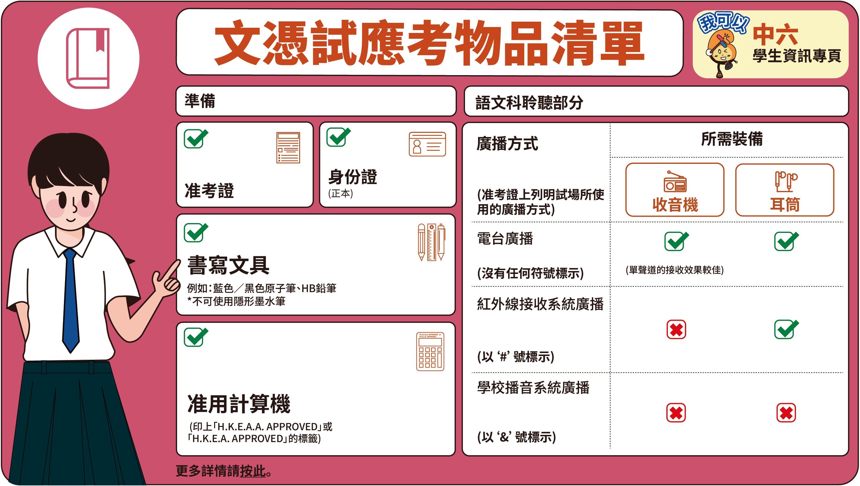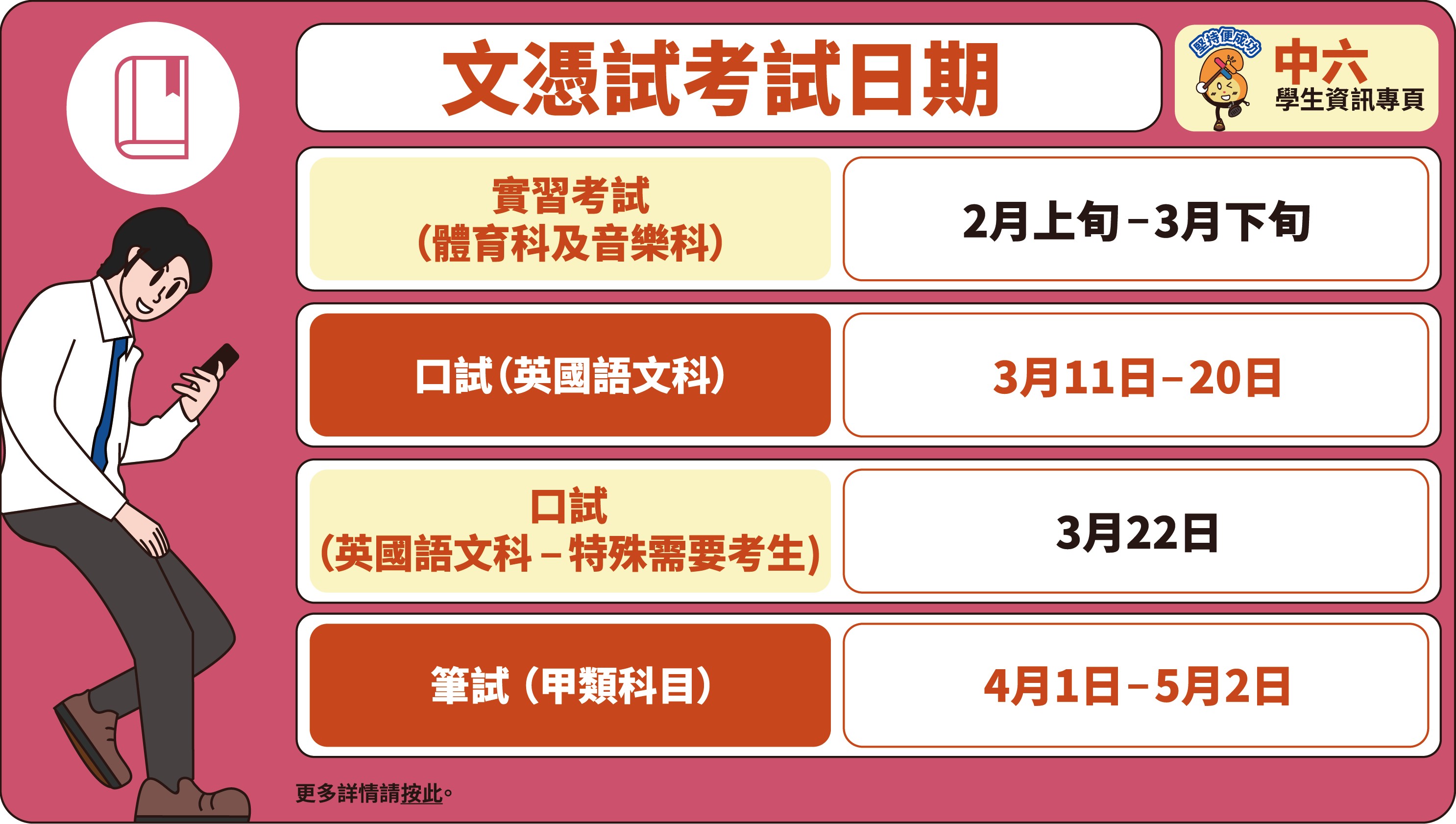 除了以上應考篇的提示,中六學生資訊專頁還提供放榜篇及多元出路篇提示,協助考生迎接文憑試不同階段!想知更多有關文憑試資訊,以及其他有關中六學生升學及就業的內容,即到專頁了解更多!