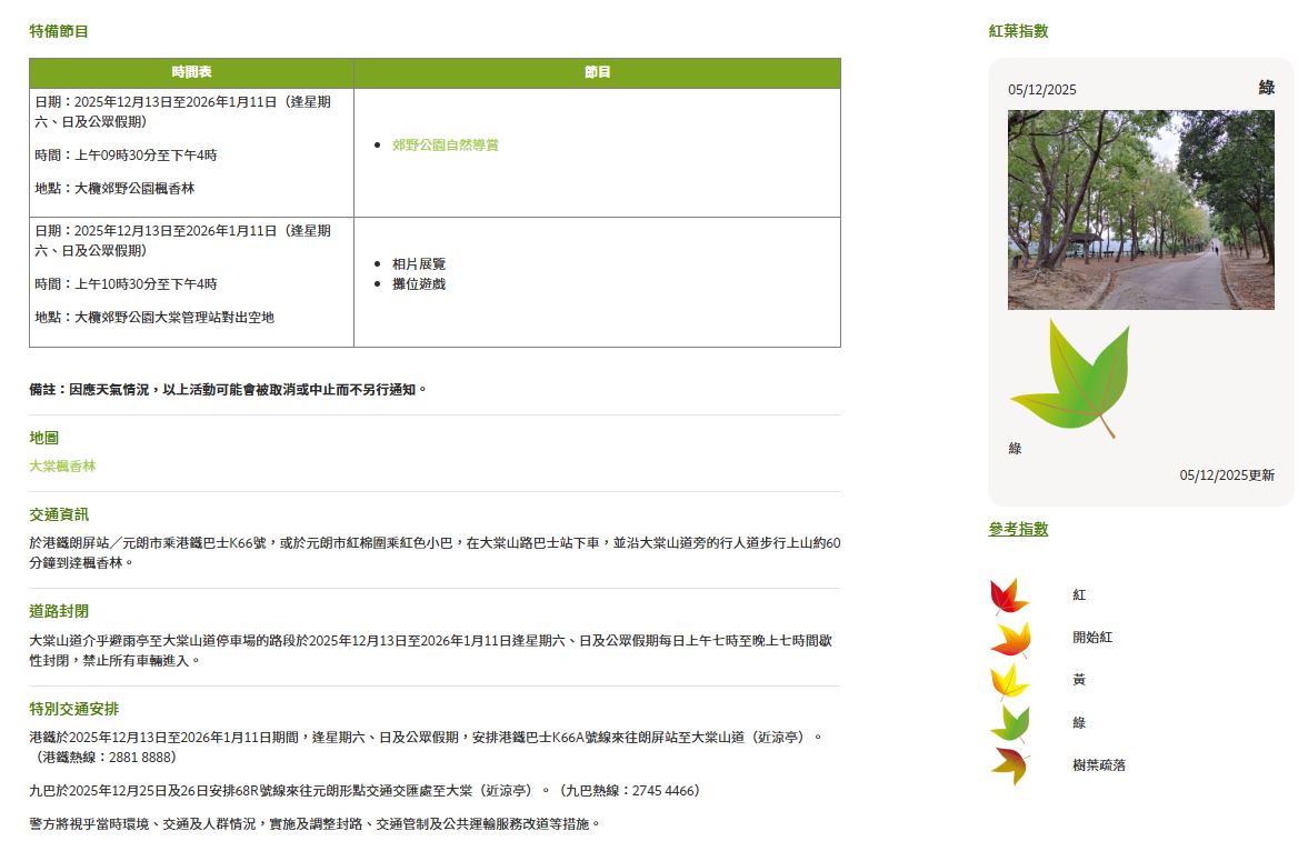 漁農自然護理署(漁護署)轄下郊野公園體驗自然網站的「紅葉情報」專頁現已推出,除了每逢星期五更新的「紅葉指數」外,亦有道路封閉及特別交通安排的資訊,方便大家計劃行程!