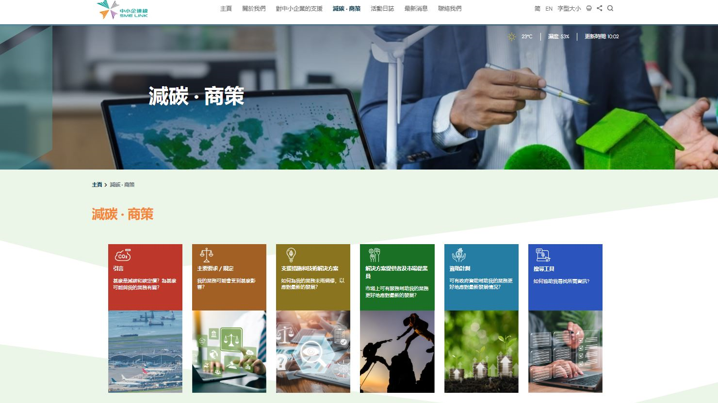 隨著全球減碳意識提高,消費者對綠色低碳產品和服務的需求不斷提升。與此同時,香港業界的主要市場的有關法律和規定亦不斷推陳出新。為協助中小企業,工業貿易署在其「中小企連線」網站下設立了一站式專題網頁「減碳 ‧ 商策」,提供香港及其貿易伙伴的要求和規定的資訊扼要、減碳和碳審計服務(包括自我評估工具)的超連結、解決方案提供者及市場從業員提供的技術解決方案和服務,以及與減碳相關的政府資助計劃的資訊。請參閱專題網頁「減碳 ‧ 商策」,或致電「中小企業支援與諮詢中心」熱線 (852) 2398 5133 或電郵至[email protected]了解更多。