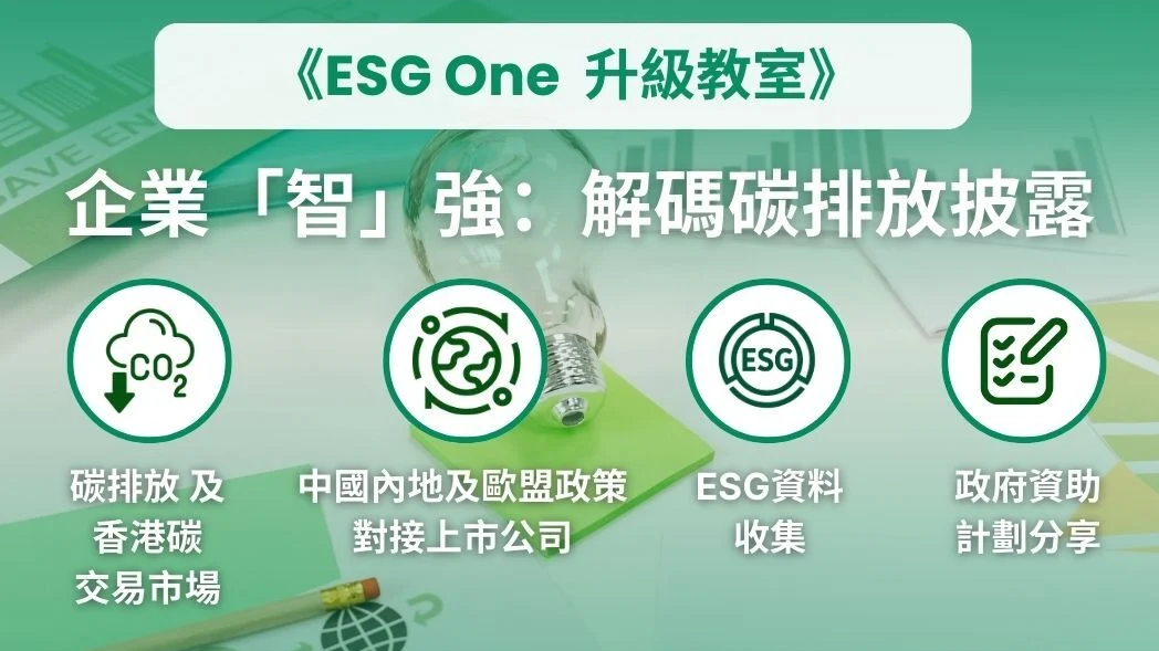 為助香港中小企搶佔綠色新機遇,HKPC ESG One 特設專題滙聚活動,以「碳排放解碼」為核心, 剖析碳排放(範圍一、二、三)的實用知識,協助企業了解中國內地及歐盟市場,以及上市公司對碳排放的要求,並提供實用資訊,協助企業收集ESG數據,以可持續發展開拓新市場。活動亮點: 專家剖析碳排放 (範圍一、二、三)及碳交易市場探討中國內地及歐盟市場最新的碳排放要求及政策,拓展海外市場對接上市公司,解碼上市公司的可持續發展要求 發放中小企ESG數據收集指南及貼士嘉賓講者: 香港循環經濟學會顧問 余遠騁博士 生產力局ESG與智能方案助理首席顧問 周曄女士 生產力局中小企一站通顧問 劉毓祥先生立即報名 - 企業「智」強:解碼碳排放披露,將您的業務開拓至可持續發展的領域!ESG One將提供更多ESG工作坊,全方位協助企業會員「永續轉型」,繼續緊貼電子報及ESG One Facebook搶先獲取最新活動概況!