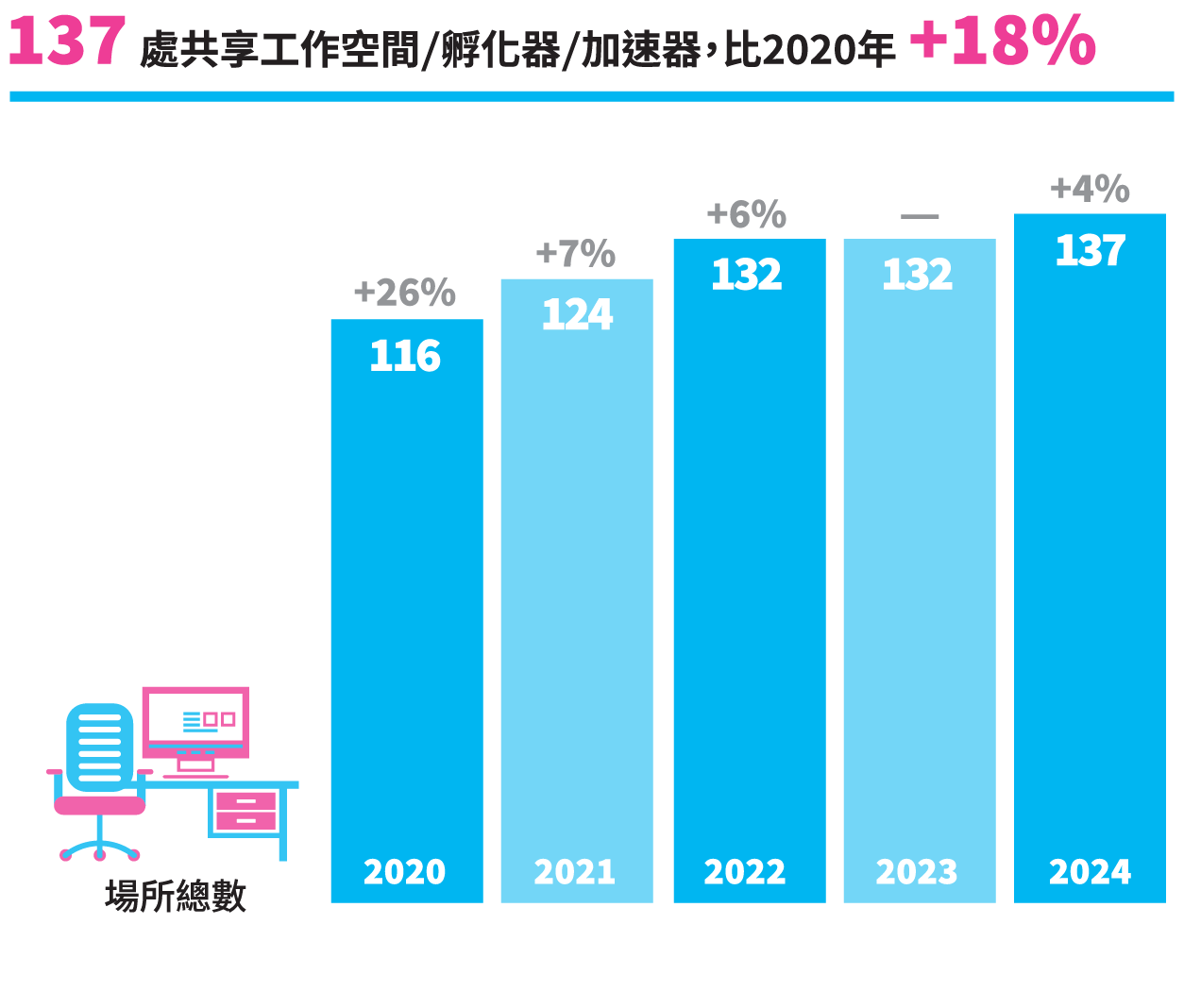 至2024年全港共有137處共享工作空間/孵化器/加速器,比2020年增多18%。