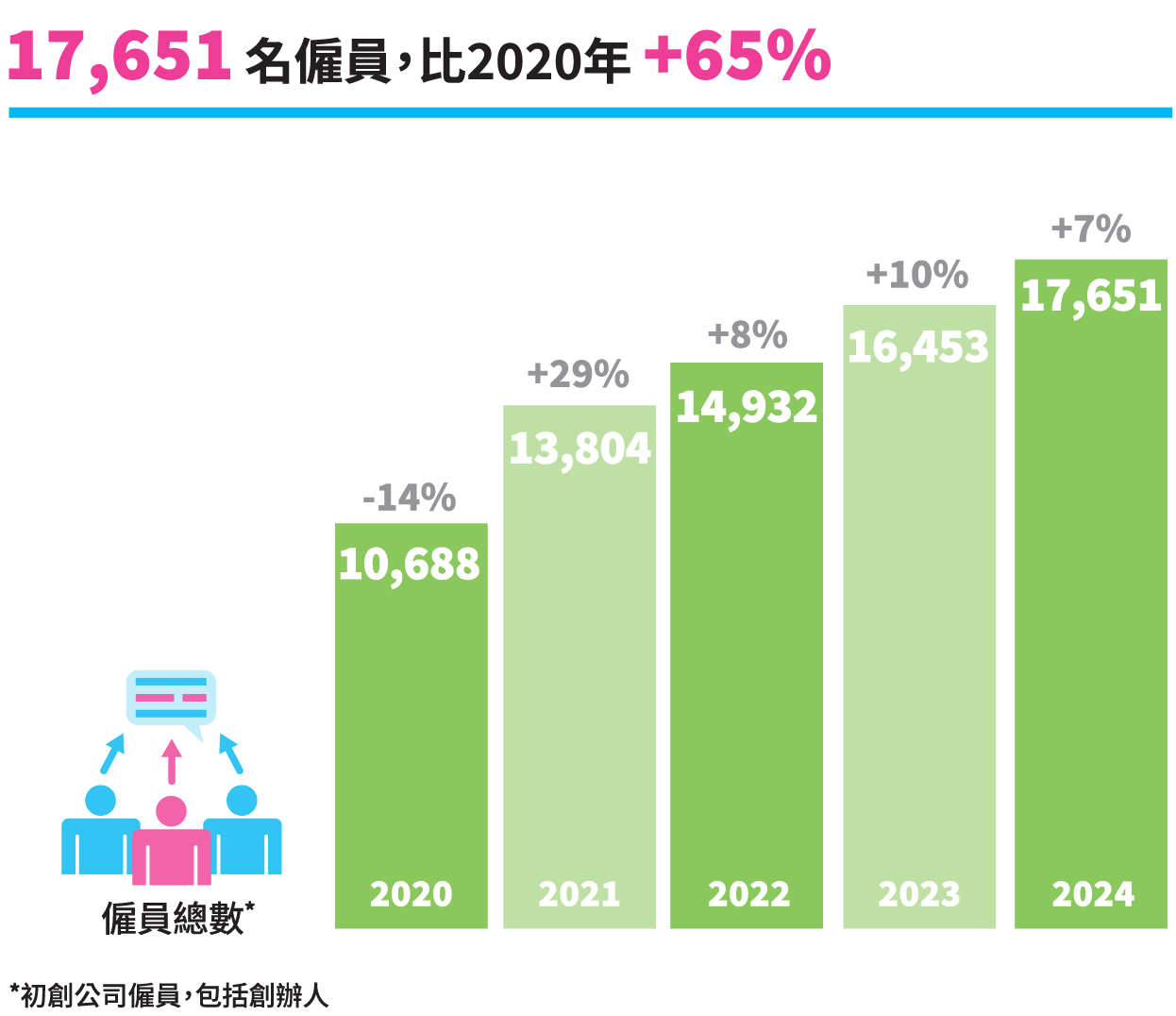 全港初創企業僱員人數於2021年起持續增長,2024年的初創企業僱員人數比2020年增加65%至17,651人。