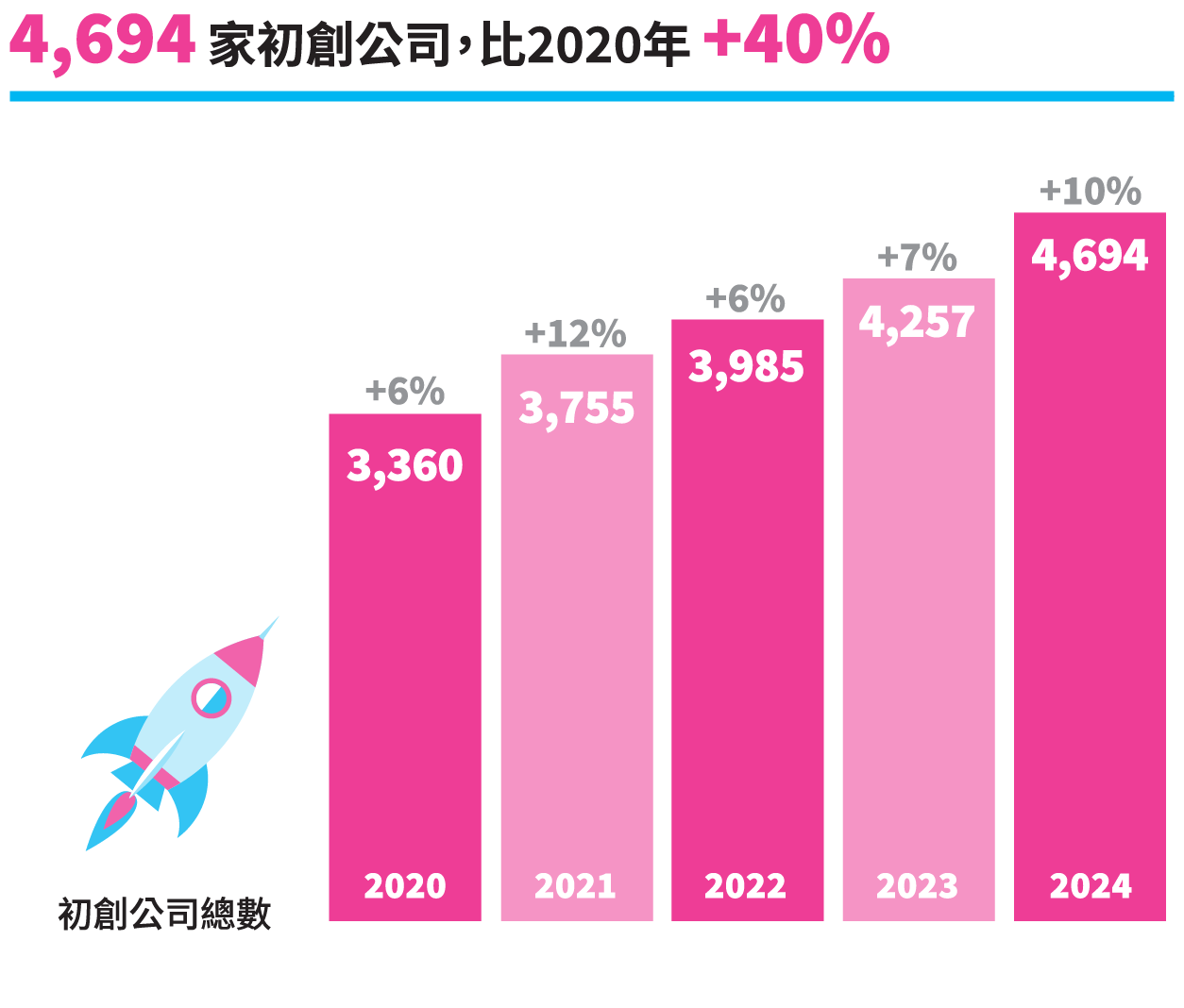 2024年的初創公司總數繼續增加至4,694家,比2020年增加了40%。