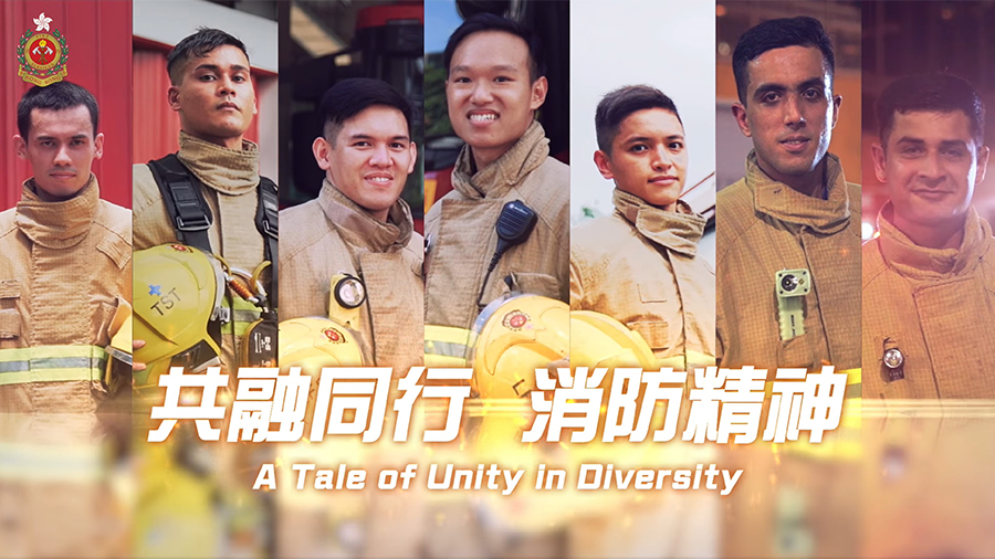 「共融同行 消防精神」是介紹幾位不同種族的消防人員,在家人和朋友的支持下,朝住自己的目標努力奮鬥。消防處擁有同一個願景,竭力維護一個有多元文化的社會。消防處會繼續致力推動文化共融,歡迎更多來自不同種族的人士加入消防處,為香港市民服務。「消防處目前有多位少數族裔的消防員和救護員,他們的種族背景包括巴基斯坦、菲律賓、越南等等。大家可以見到消防處現在有很多成功例子,不同種族背景的人士已成為消防員或救護員。其實他們可以,你們也可以。」高級消防隊長吳偉諾鼓勵不同族裔人士投考消防,為市民服務。